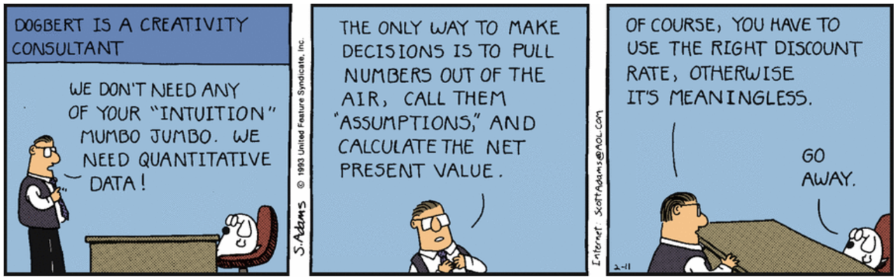 NPV depends on determining a cost of capital discount rate (Figure 1.1) reflecting the risk characteristics of the project. Finance offers CAPM, FF3F, APT, and other methods for this purpose. A basic NPV analysis assumes all equity financing, and Brealey and Myers (1981) recommends a separate analysis to determine the NPV of alternative financing.