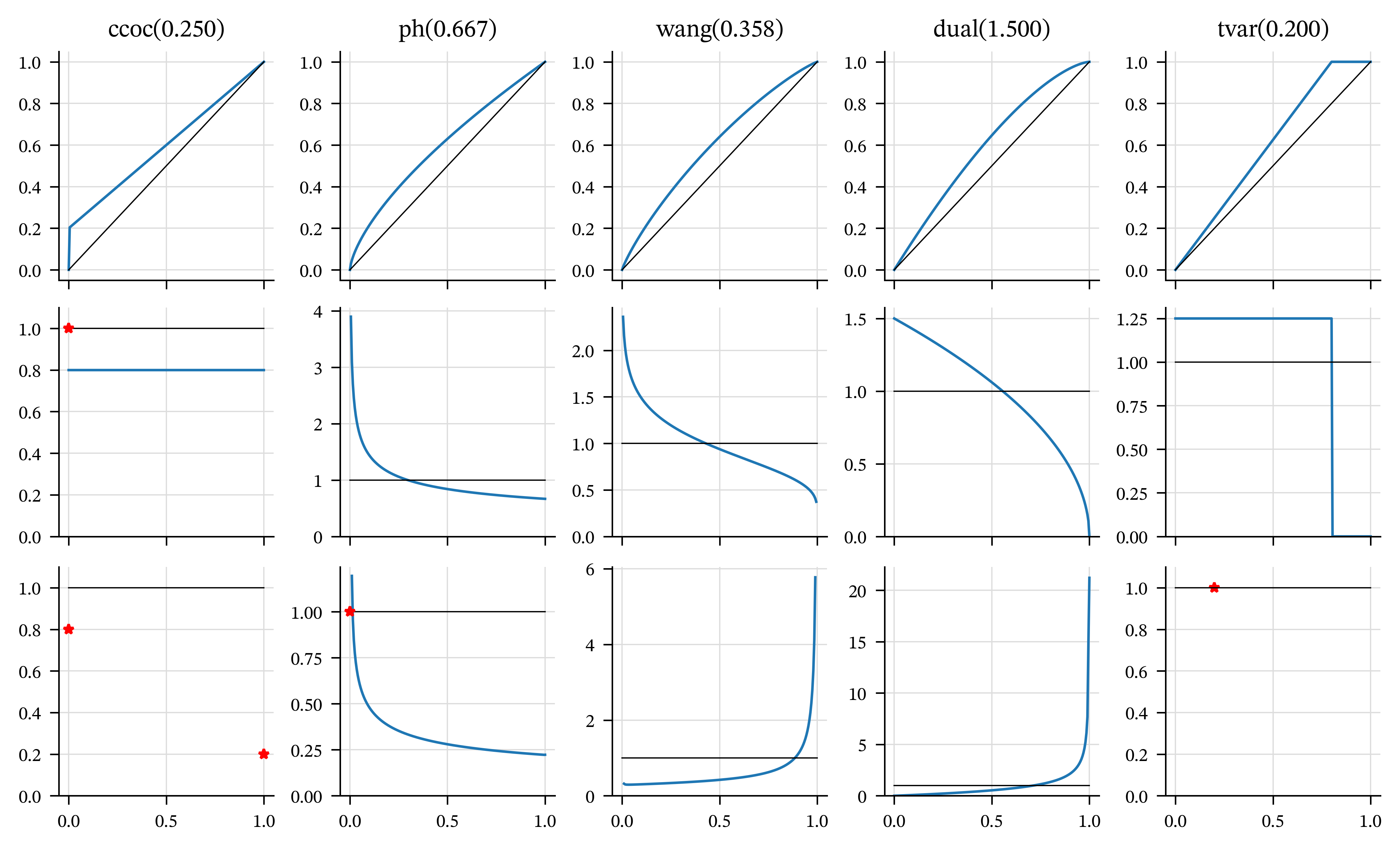 - Tail Value at Risk (TVaR), \(g(s) = 1\wedge (s/(1-p))\) for \(0 \le p < 1\).