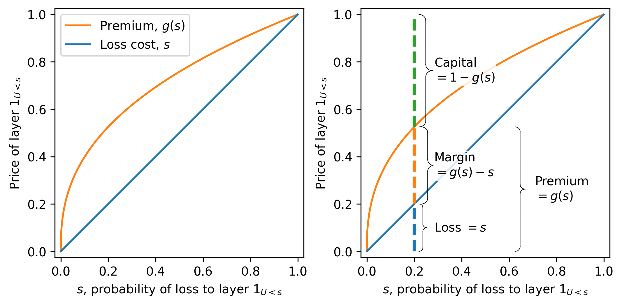 Figure fig-distortion-10-3 illustrates a typical concave distortion. The horizontal axis shows \(s\). Various insurance market statistics for the layer can be read off from \(g\). The expected loss equals the distance from the horizontal axis to the diagonal, the expected margin from the diagonal to the curve, and the capital from the curve to the top of the figure. The figure height equals 1, the outcome value of the Bernoulli layer in a loss state.