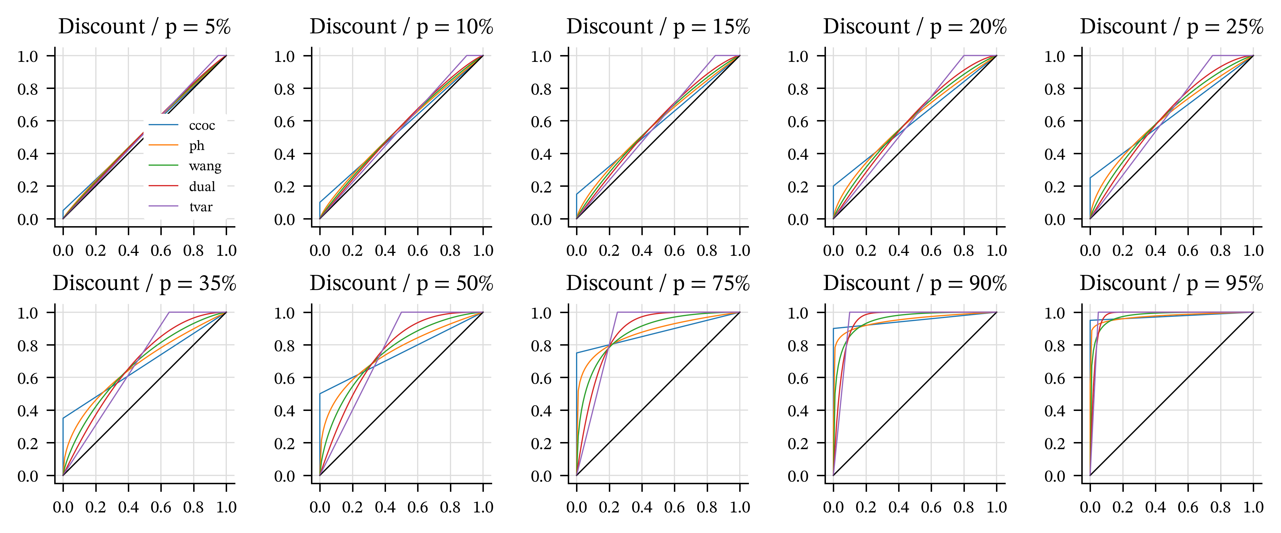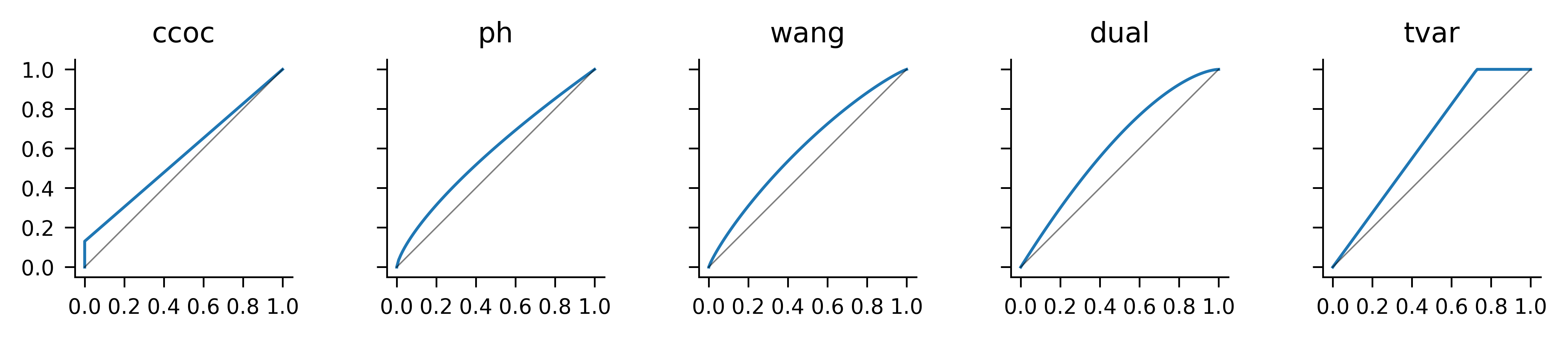 For fixed \(s\), the PH increases with decreasing \(\alpha\) and the other four increase with their parameter. Figure fig-example-distortions plots examples of each, with broadly comparable parameters. The pictures are consistent with the various properties assumed and asserted above for distortions. Table tbl-the5dists recaps the formulas for each \(g\) and shows the parameters used in the plots.