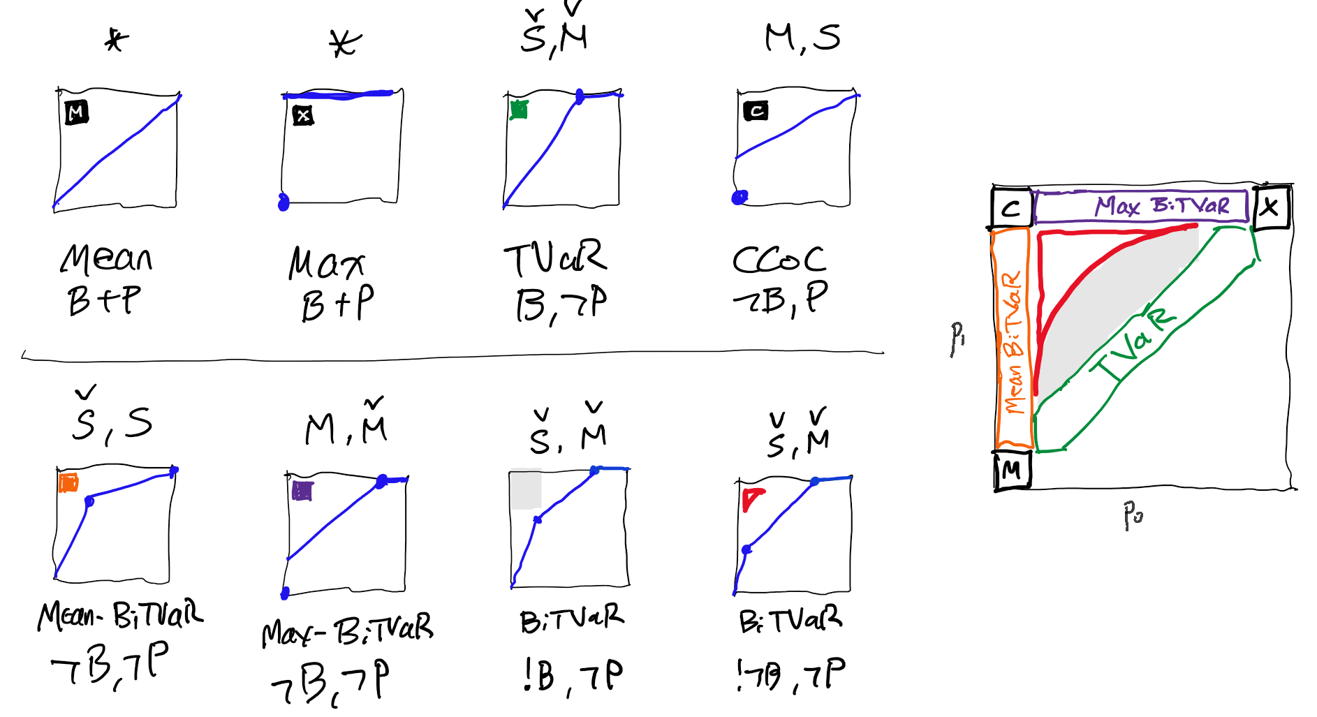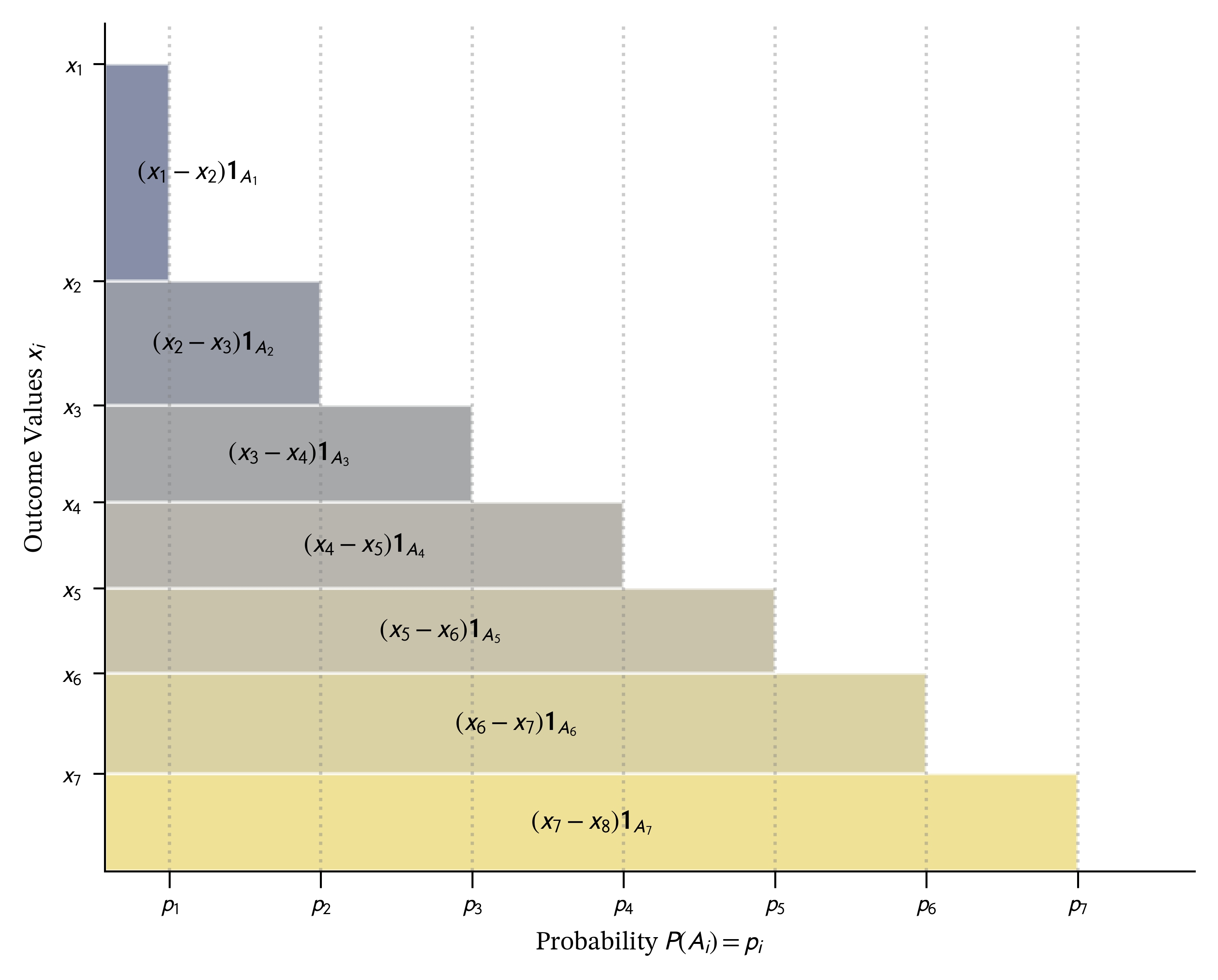 Remark 4.4 (Historical note). The idea for Bernoulli pricing schedules goes back to Choquet’s work on non-additive measures and the Choquet integral (1953), and it reappears across fields under many names: distortion risk measure and weighted VaR in insurance and finance; spectral risk measure in coherent risk theory; probability weighting and rank-dependent utility in decision theory; the Wang transform and related pricing maps in actuarial science. Despite the different labels, the template is the same: keep track only of the distribution (law-invariant), reshape probabilities through \(g\) to capture risk aversion or market frictions, and then value payoffs by integrating against that reshaped probability. With this lens, familiar constructions like bid/ask pairs, tail risk emphasis, and premium principles emerge as simple transforms of \(g\).
