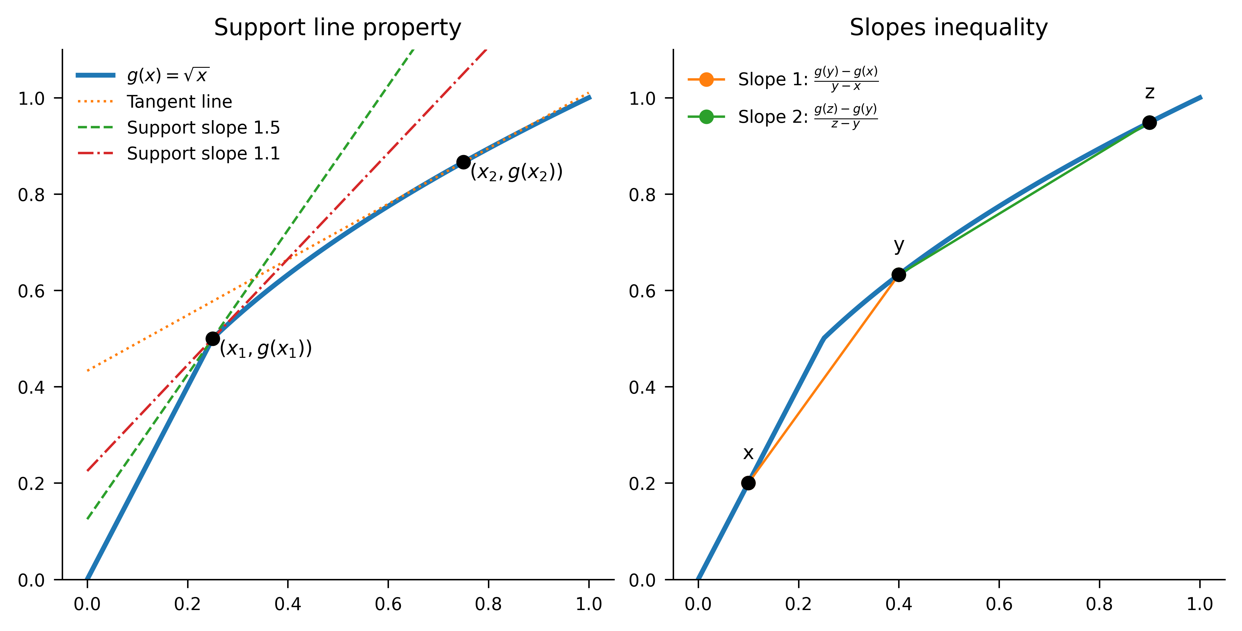 Concavity has a tangent line interpretation. If \(g\) is differentiable at \(x\), then for all \(y\in [0,1]\), \[ g(y) \le g(x)+g'(x)(y-x), \] i.e., the graph of \(g\) lies below its tangent line at every \(x\). If \(g\) is not differentiable, replace the tangent by any supporting line \(L\) at \(x\), that is, a line touching the graph of \(g\) from above. Then \(g\) is concave iff \(g\) lies at or below every support line at every point. Figure fig-slopes-chords illustrates these ideas a point where \(g\) is differentiable and one where it is not.