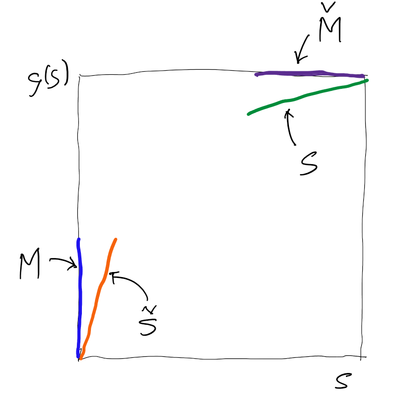Geometrically, the graph of \(\check g\) is obtained by a point reflection of the graph of \(g\) through \((1/2, 1/2)\); see (REF?). Therefore, \(\check g(0)=0\), \(\check g(1)=1\), and \(\check g\) is increasing. If \(g\) is concave, then \(\check g\) is convex. Taking the dual twice returns the original function: \(\check{\check g} = g\) since \(\check{\check g}(s)=1-\check g(1-s)=1-[1-g(1-(1-s))]=g(s)\).