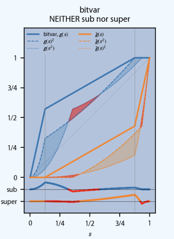 Figure fig-bitvar-sub-super-proof illustrates the concepts used in the proof, showing the cusp where \(g\) most fails to be sub-multiplicative in red around \((1/2, 1/2)\) above the diagonal. The horizontal lines at the bottom show \(g(s)^2 - g(s^2)\) and \(\check g(s)^2 - \check g(s^2)\) respectively.